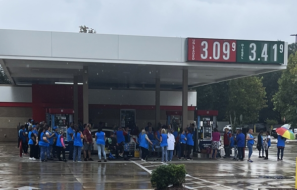 Employees were seen gathering under the canopy at the Murphy USA gas station in front of the Walmart to avoid the rain after the store was evacuated.