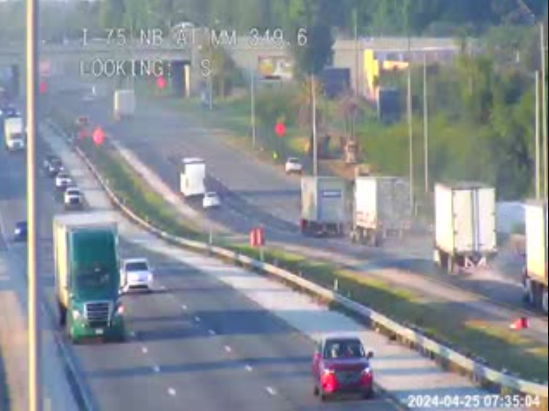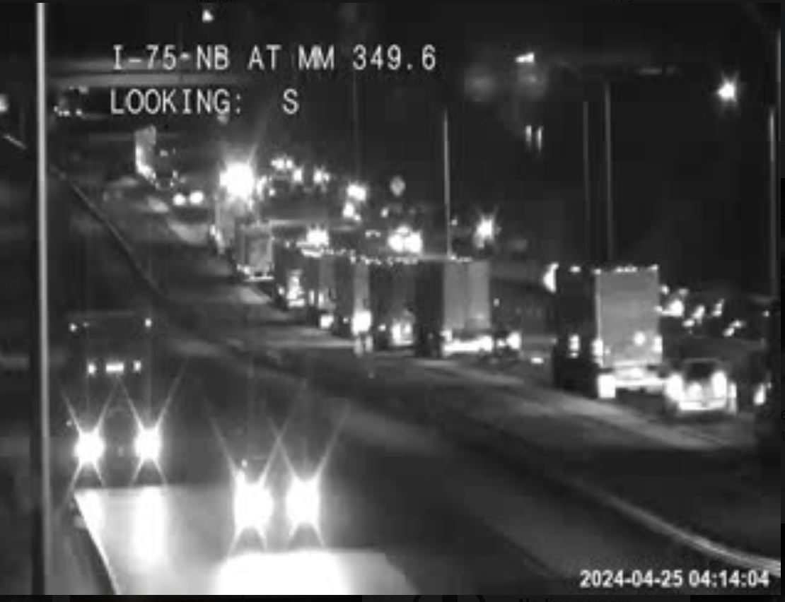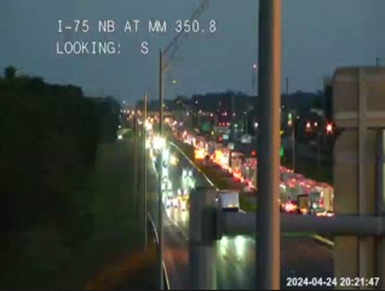 UPDATE, 4:30 p.m.: A check of the state’s traffic cams shows traffic still backed up on I-75 southbound. This image is from mile marker 350.