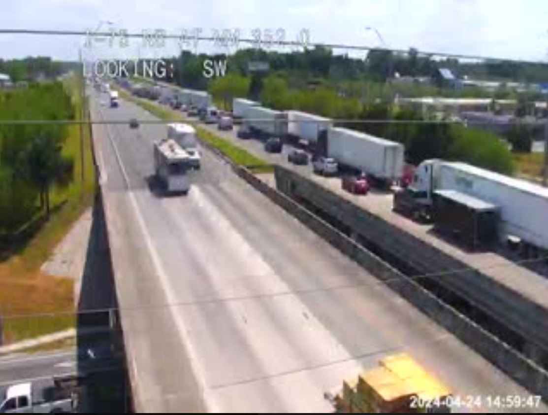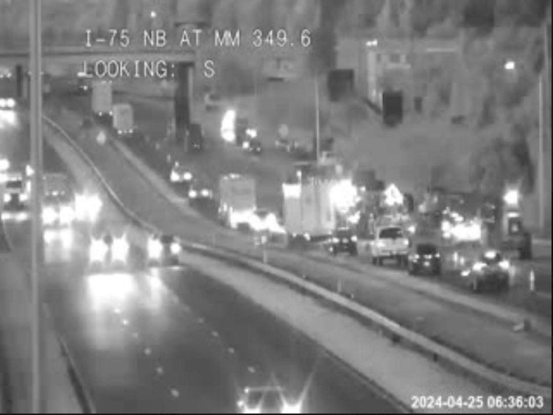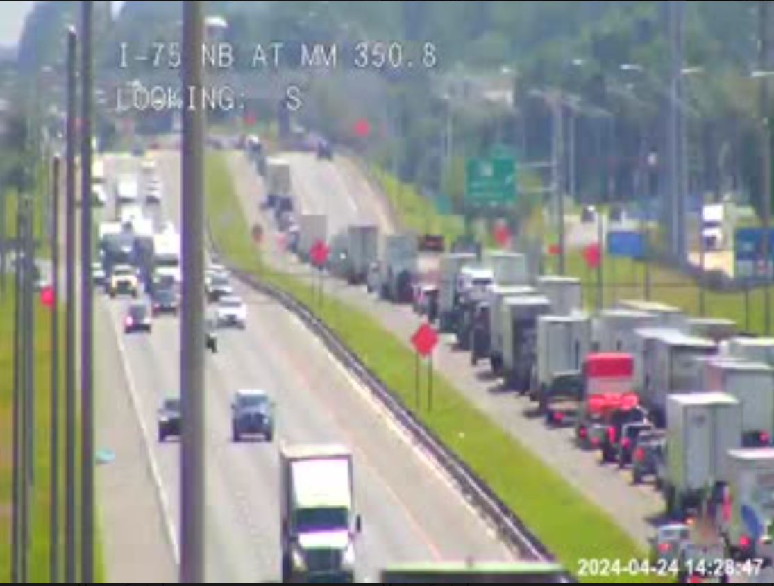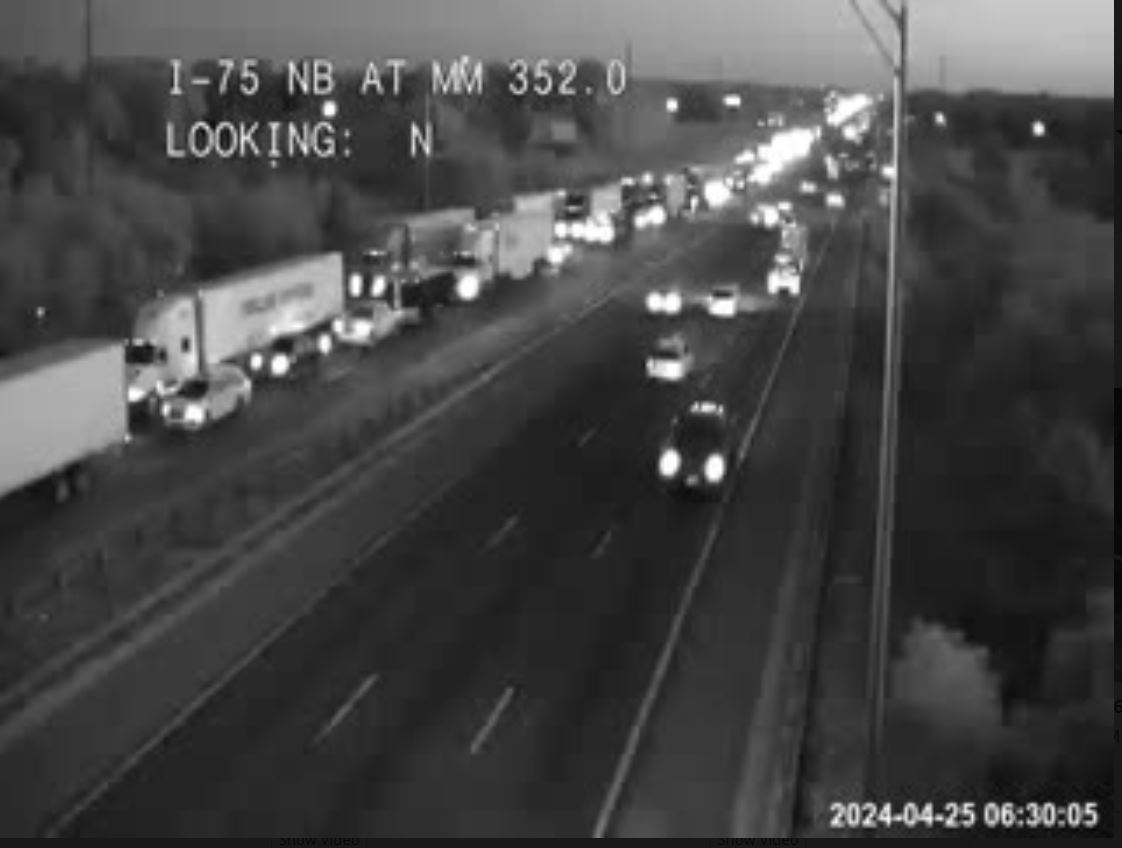 UPDATE, 4:30 p.m.: A check of the state’s traffic cams shows traffic still backed up on I-75 southbound. This image is from mile marker 350.