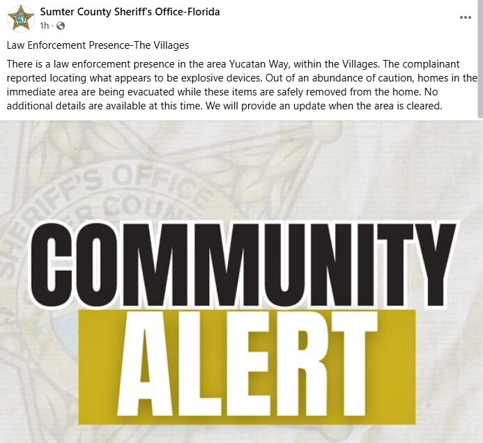 According to a social media post by the Sumter County Sheriff’s Office, homes in the immediate area of Yucatan Way in the Village of Rio Rancho are being evacuated following a report of what appears to be explosive devices.