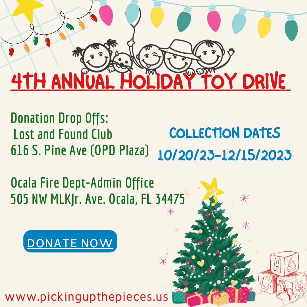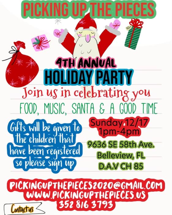 This month they’re hosting a toy drive for children who lost their parents which will culminate in a party on Sunday, Dec. 17, from 1:00 p.m. to 4 p.m. at the Disabled American Veterans Hall at 9636 SE 58th Ave. in Belleview.