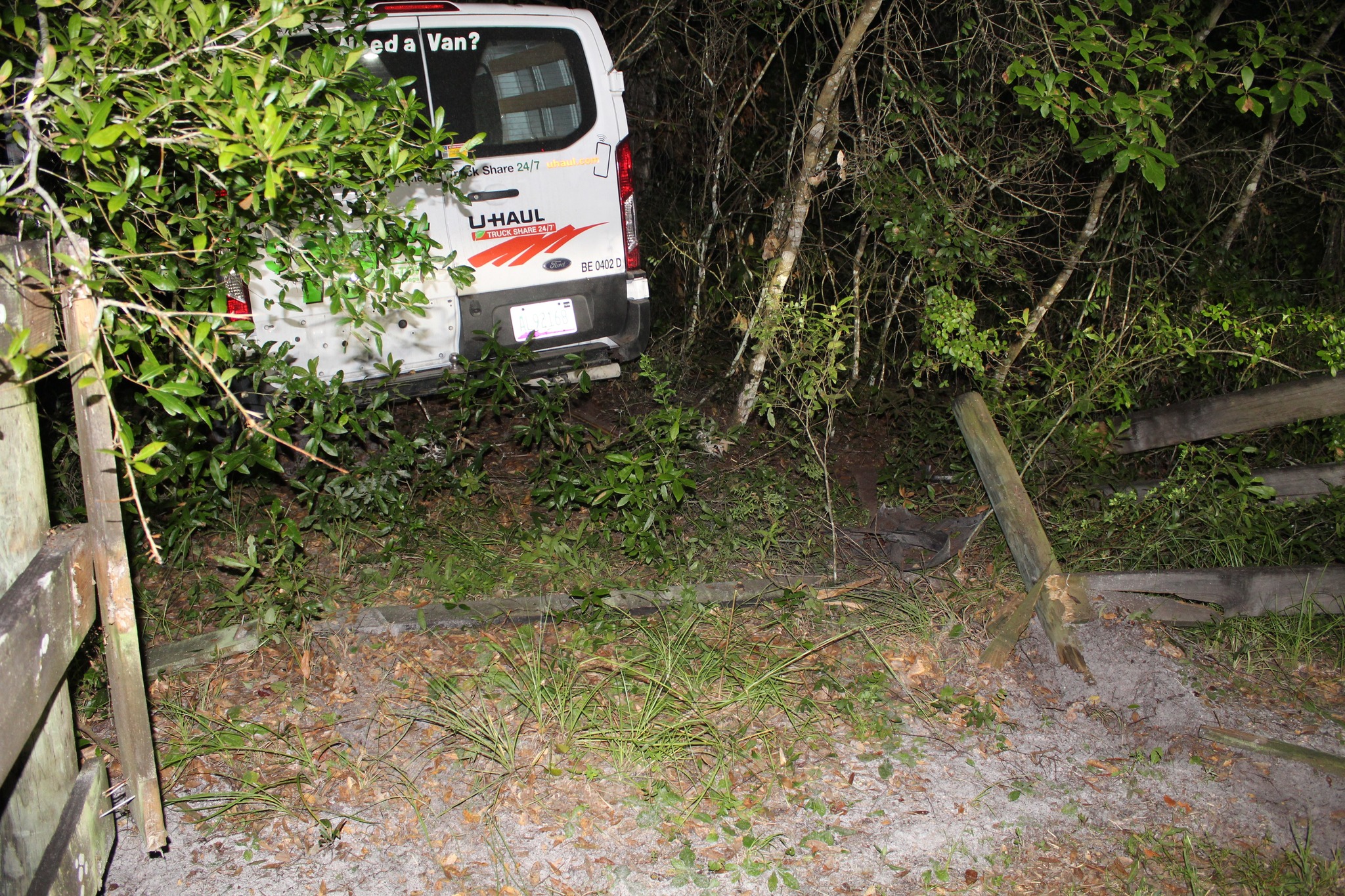 The U-Haul plowed into a wooden fence then crashed into a tree