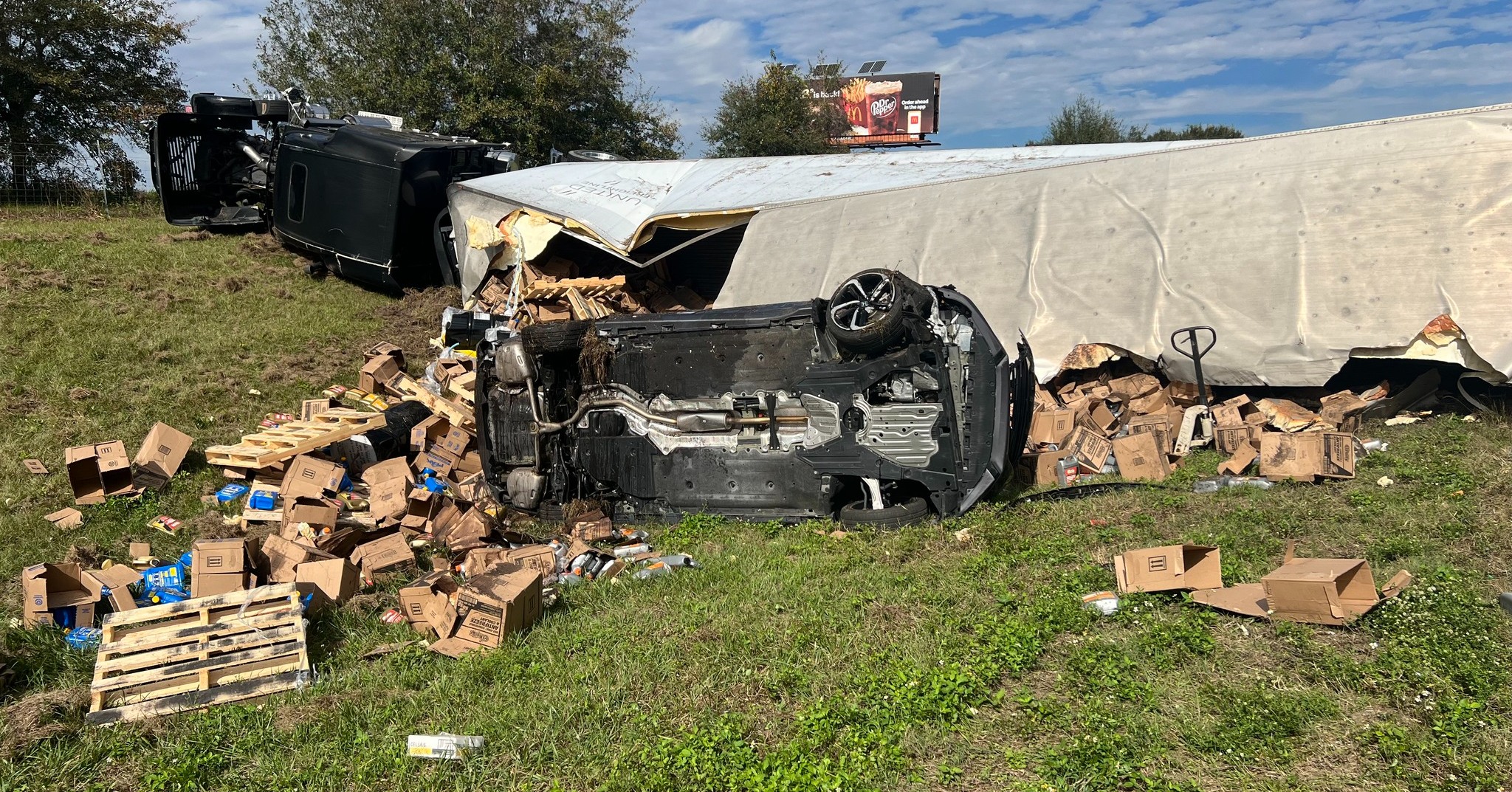 Marion County Fire Rescue (MCFR) crews are also on the scene. They say the 18-wheeler had a load of hazardous materials, including barrels of antifreeze, motor oil, and diesel fuel.
