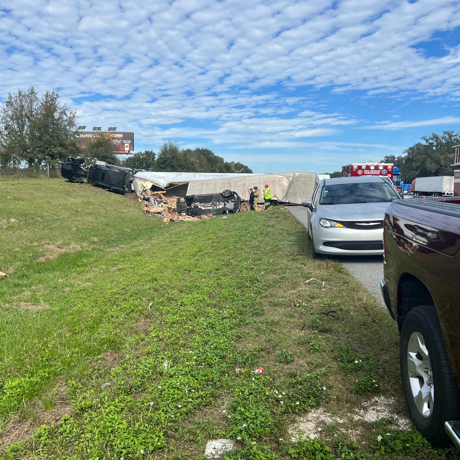 Emergency crews are on the scene of an overturned tractor trailer near mile marker 356. Authorities say the semi and another vehicle crashed on the west shoulder approximately two miles south of County Road 326.