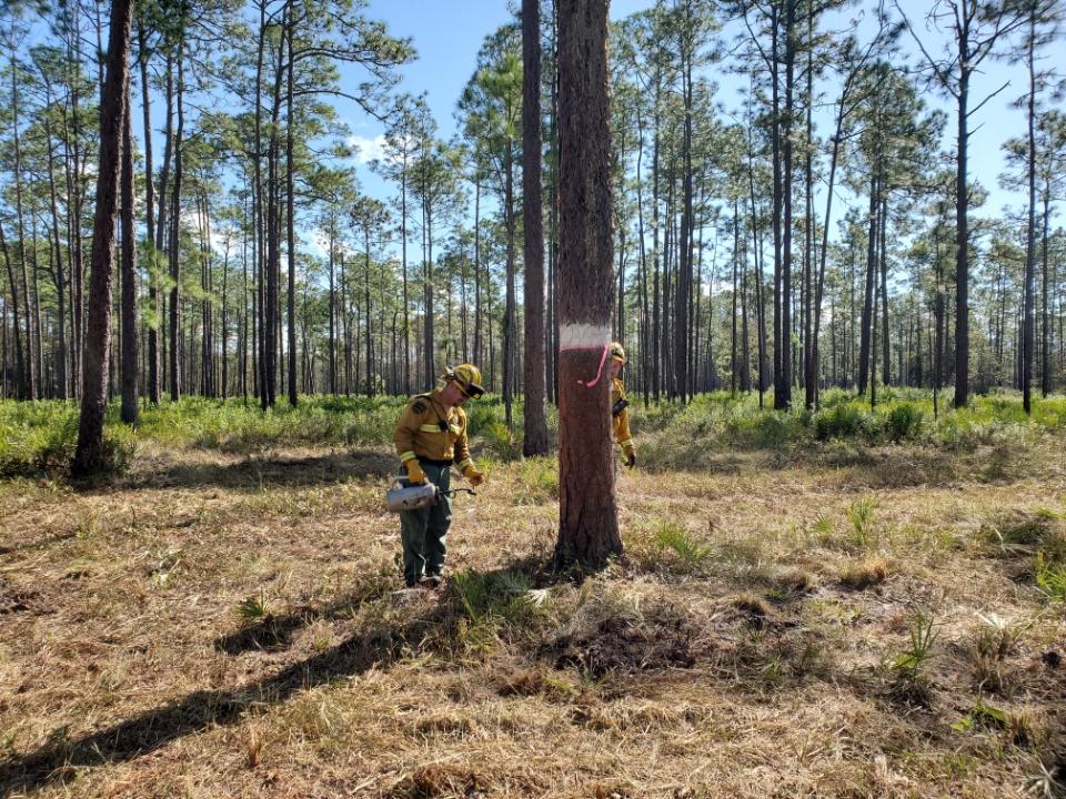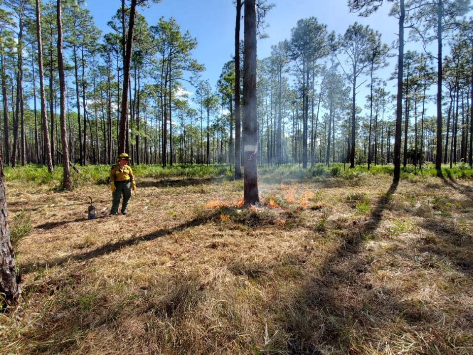 The service says a controlled burn around the base of the trees will eliminate larger fuel sources, reducing higher flame heights and prolonged burning that could ignite pine sap, potentially harming the birds during prescribed burns or wildfires.