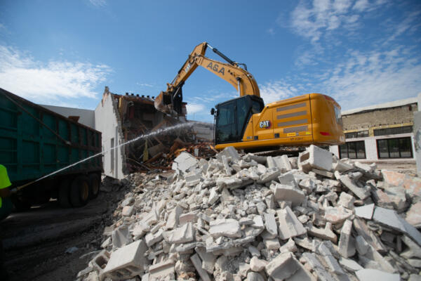 During the demolition, the debris was carefully managed with a focus on sustainability. Most of the materials were set aside for recycling on-site. Concrete pieces were crushed right on the property and will be used to create the base for the new parking lot. Additionally, recycled asphalt will be used to finish this environmentally friendly project.