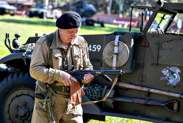 The event included a weapons demonstration led by the group’s Secretary-Treasurer, Verne Jenkinson, a trained reenactor portraying a British armored crewman from the D-Day campaigns of 1944-1945 in Northwest Europe. “I’ve brought my Humber LRC, and we just completed a weapons demonstration,” he shared. “The collection showcases vehicles from across eras, with Humvees and a helicopter on display.”