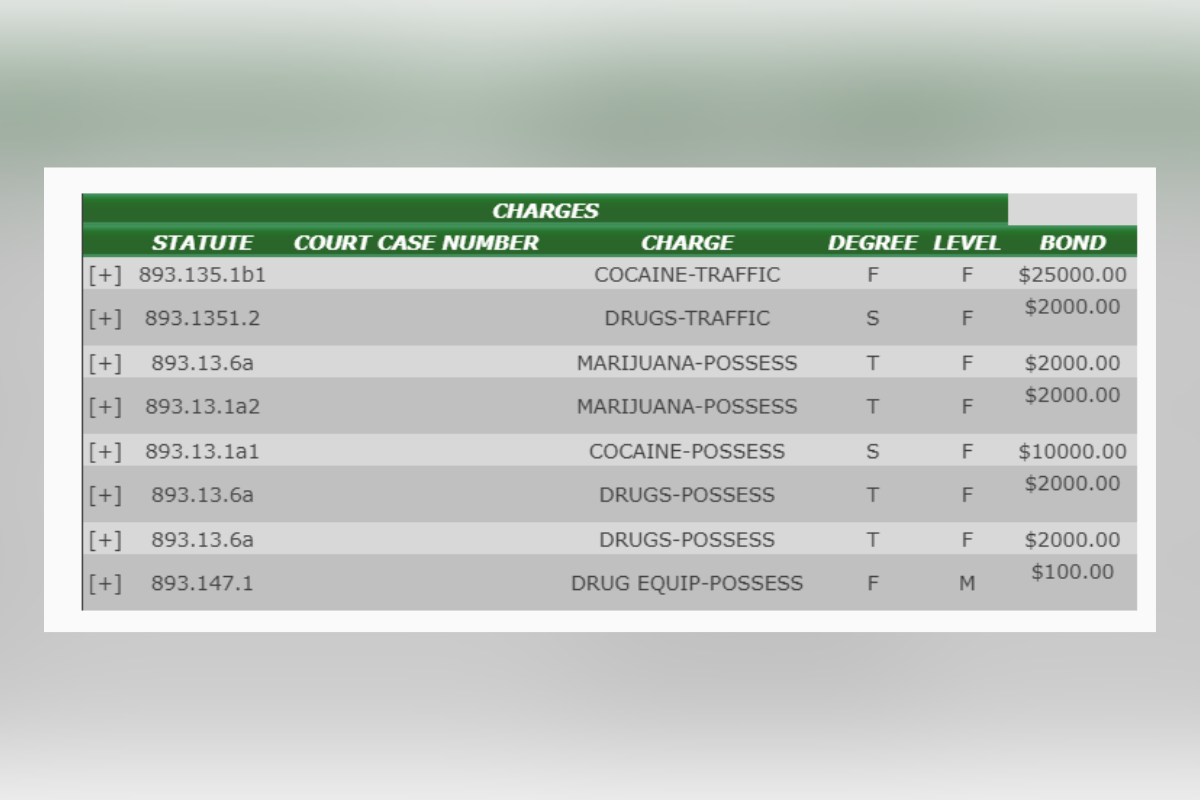 They arrested and charged him with trafficking in cocaine, possession of marijuana with the intent to distribute, possession of a firearm by a convicted felon, possession of a controlled substance (oxycodone), and possession of drug paraphernalia.