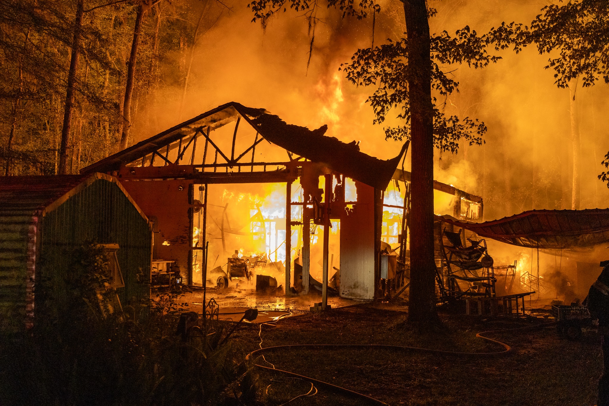 According to fire rescue, the 911 caller stated the fire started in a large workshop, spreading to adjacent sheds and catching trees on fire.