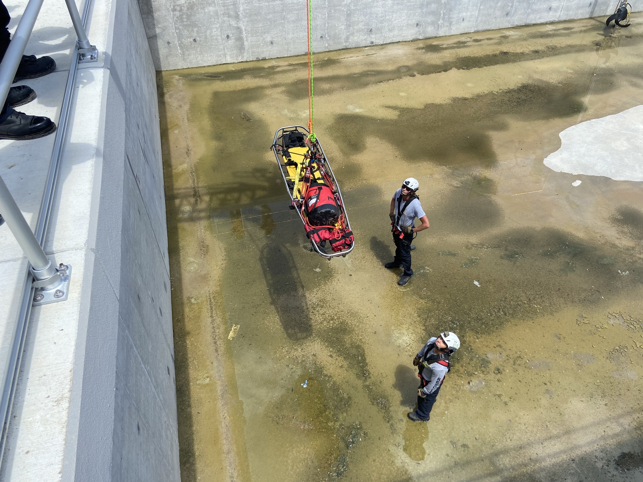 The stokes basket was lowered via a tower from one of the firetrucks.  Paramedics strapped the worker into the stokes basket while firefighters hoisted him back up.