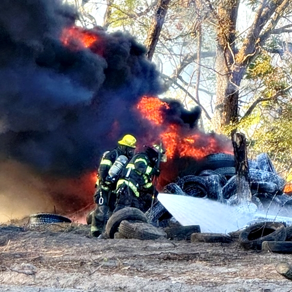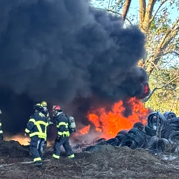 MCFR says that the blaze, reported at 2:06 p.m., involved a 100’ x 30’ pile of tires that sent flames shooting 50 feet into the air, catching nearby trees on fire.