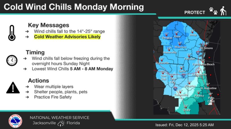 MARION COUNTY, FL (352today.com) – The Marion County Sheriff’s Office announced that the National Weather Service has forecast colder than usual temperatures for the 352 overnight from Sunday, Dec. 14 into Monday, Dec. 15, 2025.