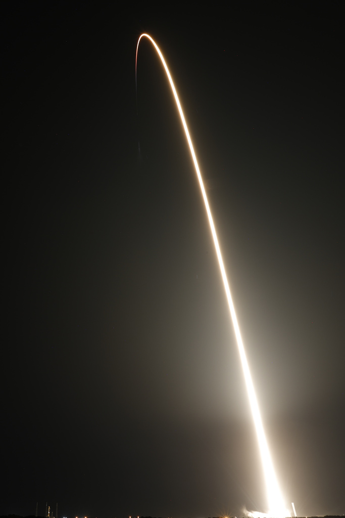 SpaceX’s first-stage booster returned to Cape Canaveral several minutes after liftoff, an extra treat for the thousands of spectators gathered in the early-morning darkness.