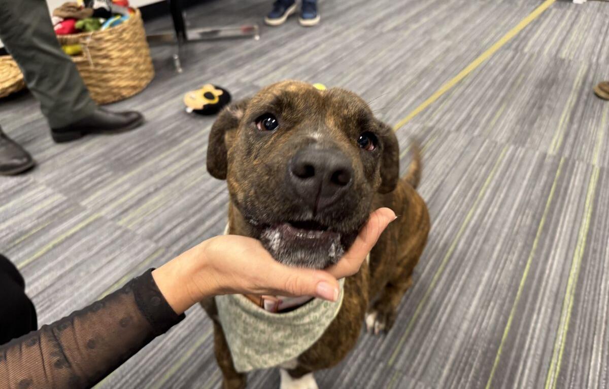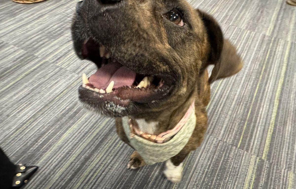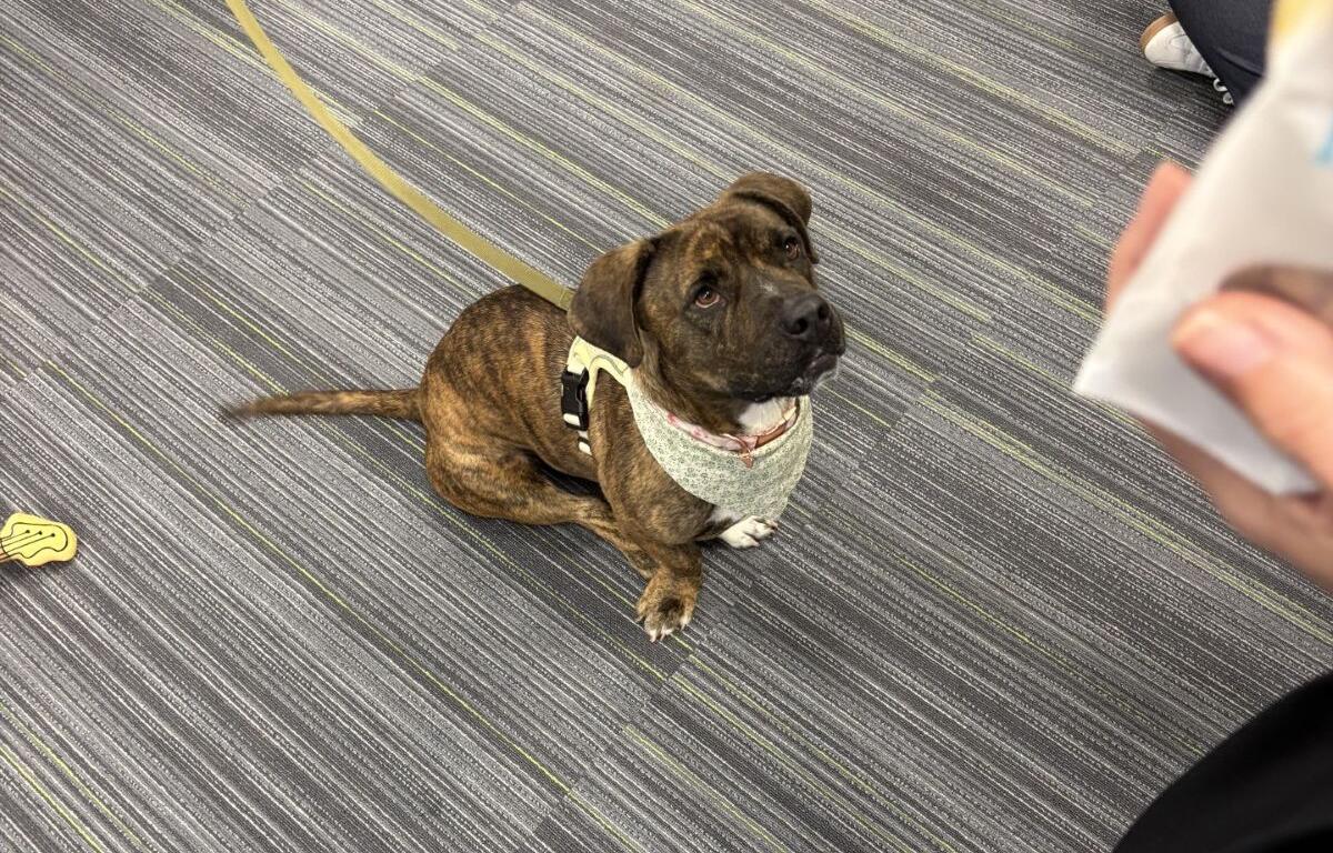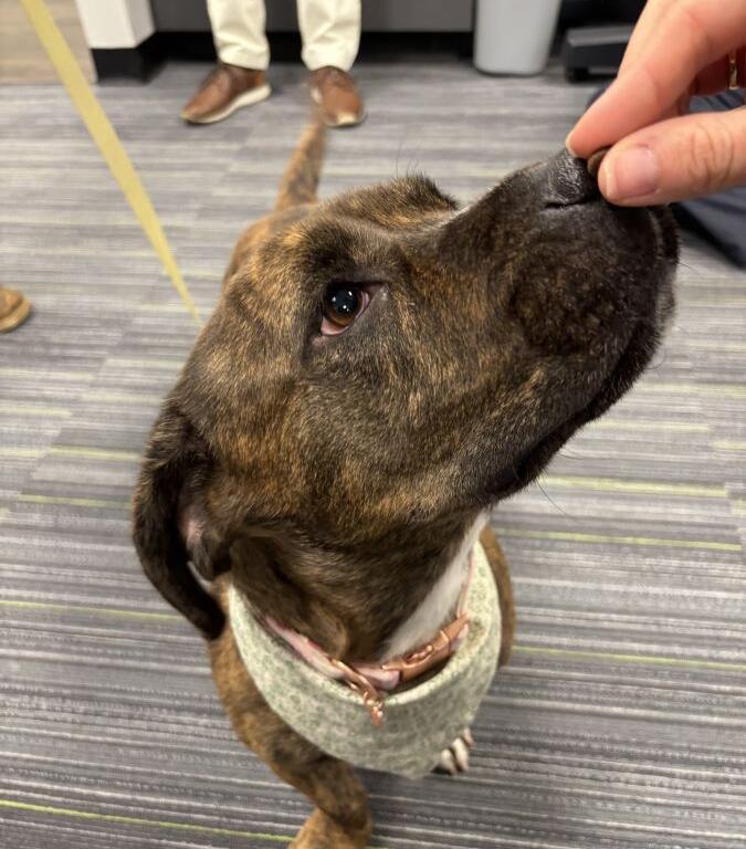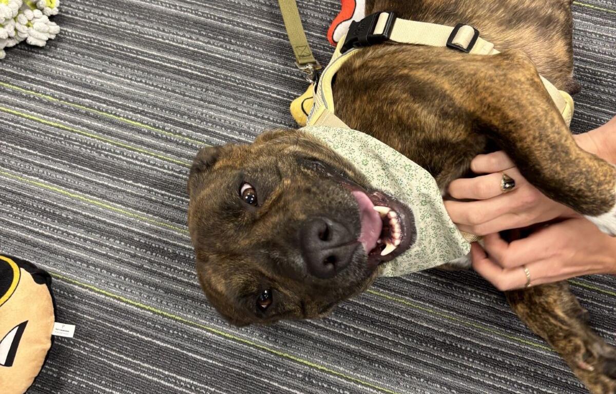 Chevelle came to HSMC about two months ago as a stray who’d clearly given birth to a litter previously. Opinions vary on exactly what kind of mix she might be, though she definitely resembles a brindle blend of bully and basset. She’s more interested in exploring her surroundings, loving on new human friends and getting treats than in playing tug-of-war. She’s also a little too interested in exploring new feline roommates, so a cat-free residence is probably in everyone’s best interest.