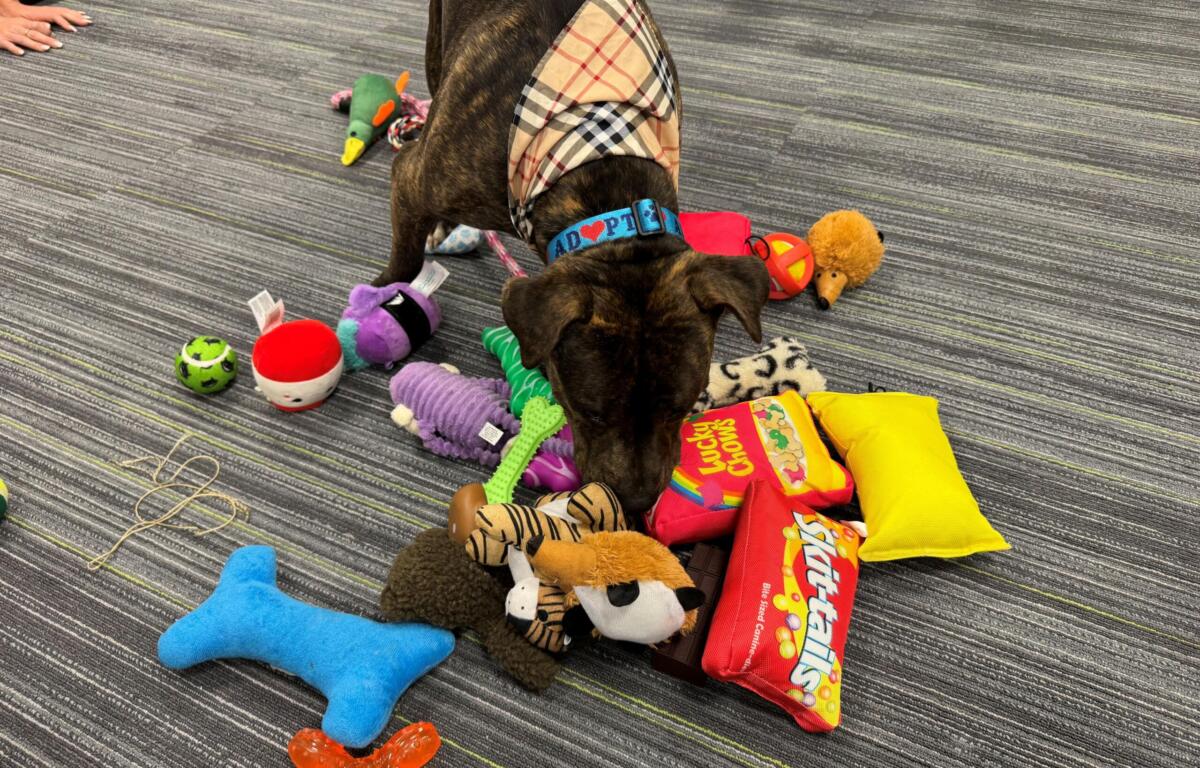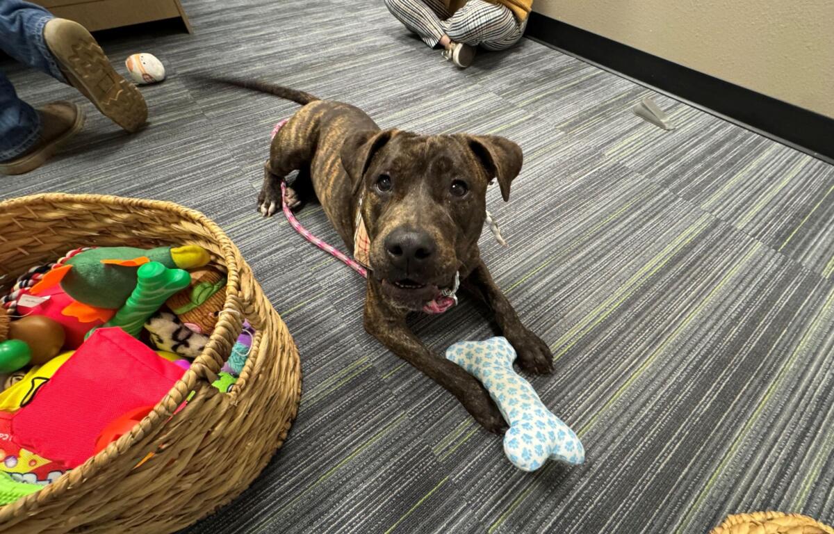 Tiana has a very doll-like personality and appearance. Her soft, dark brown, brindle fur and land-seal-like facial features make her positively adorable. Her dense figure showcases 60 pounds of love that she has to give. When Tiana was faced with the impossible option of choosing her favorite toy, she was overwhelmed with happiness. Her playstyle is very dainty and the only noise she makes is the happy squeaks of a new toy. She plays well with other dogs but does not get along with cats.