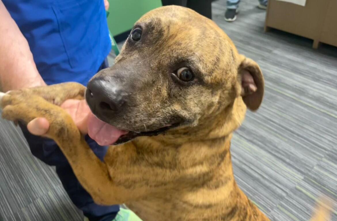 This beautiful brindle mutt originally came to MCAS as a stray last June. He was adopted in March, but his new owners’ other dog got a little territorial, so he’s back on the market and looking for his forever home.