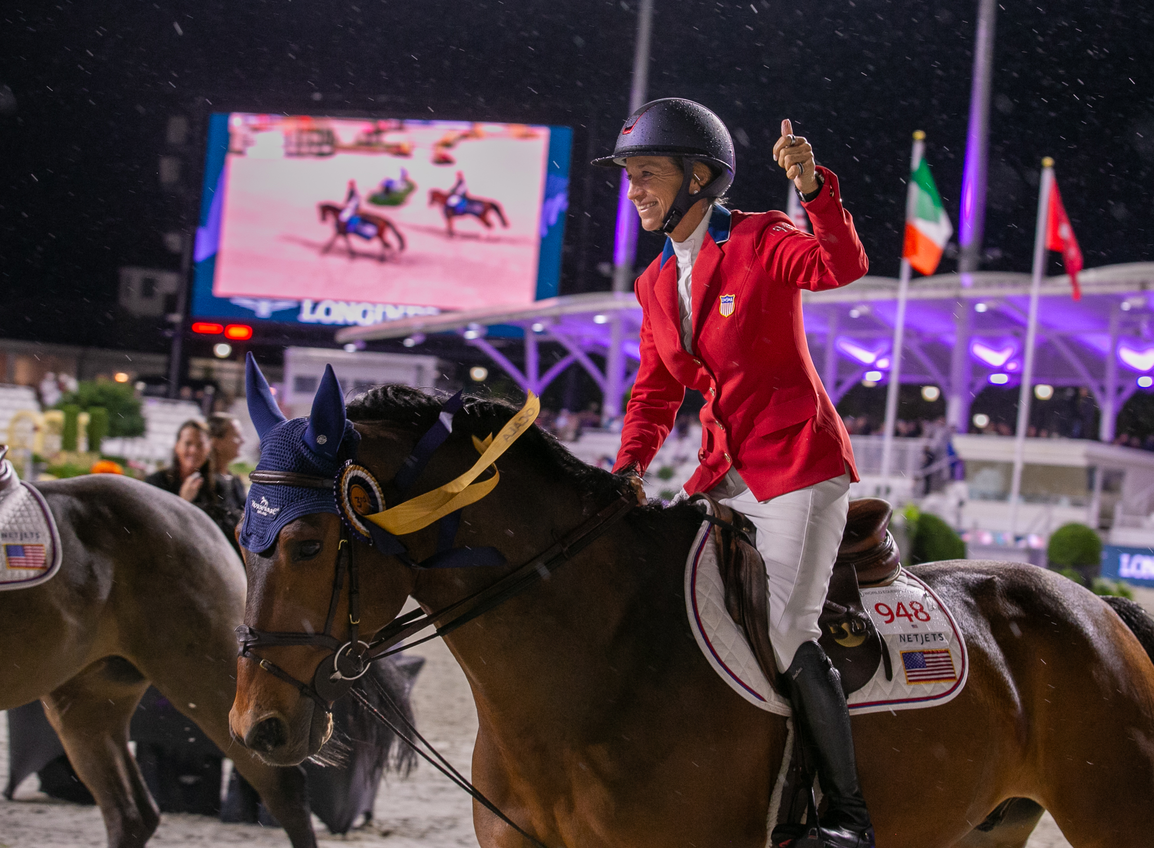 Team USA started off the night by proving the simplicity of the course, finishing round one with three clears. Kraut joked that Wade “got even” in the second round when the team racked up 12 penalties and lost their first-place position.