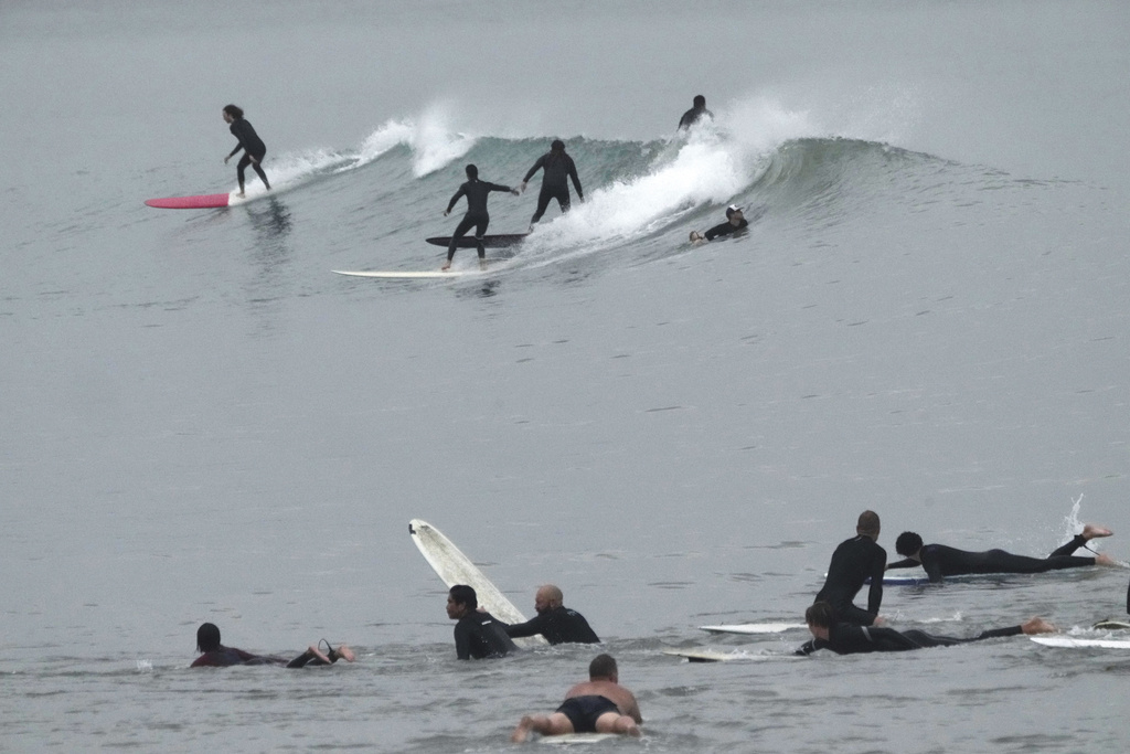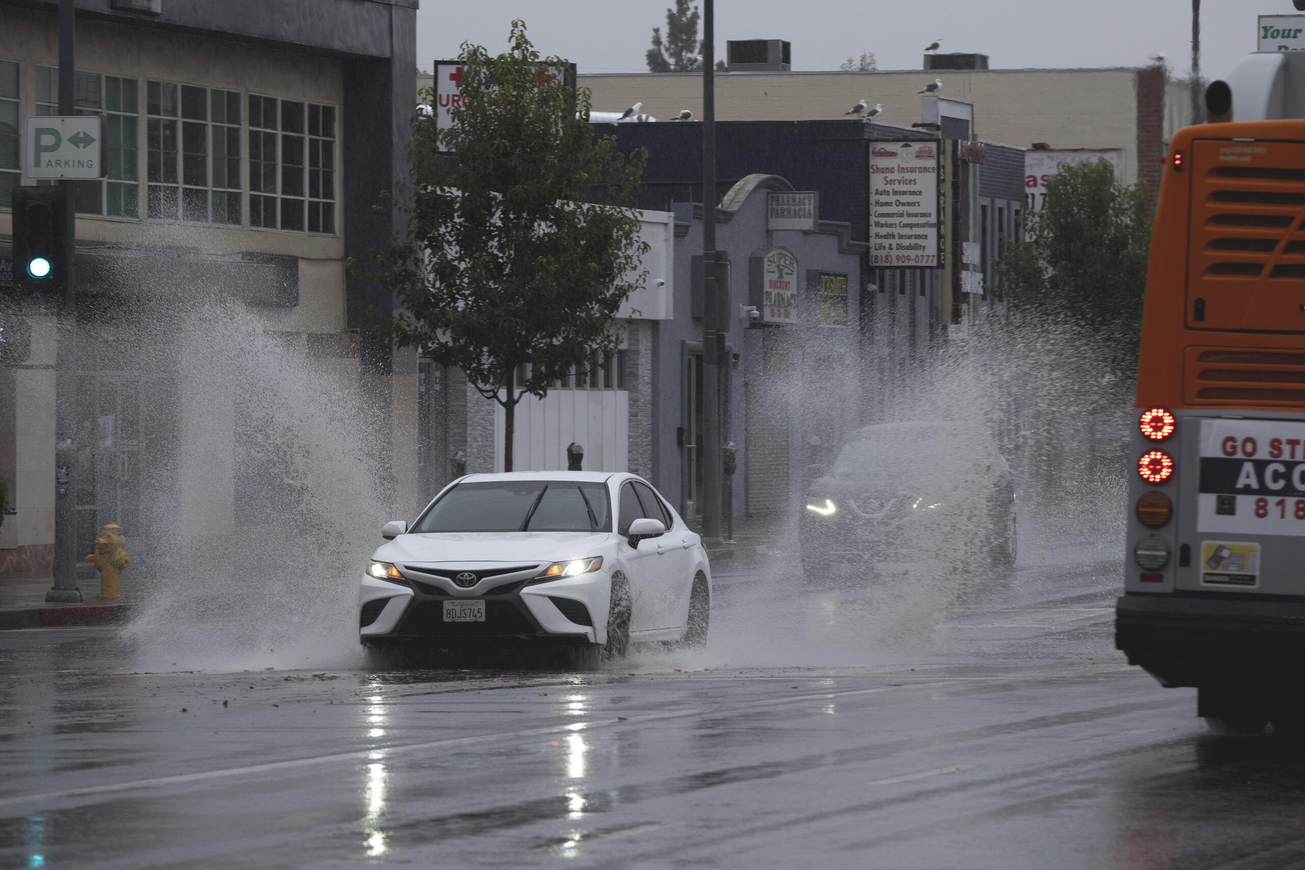 Light rain fell across normally sunny Southern California through Sunday morning, soaking streets from Los Angeles to San Diego. Some joggers took advantage of the cool rain in San Diego’s Waterfront Park while surfers braved Orange County’s breakers ahead of the coming wind and rain.